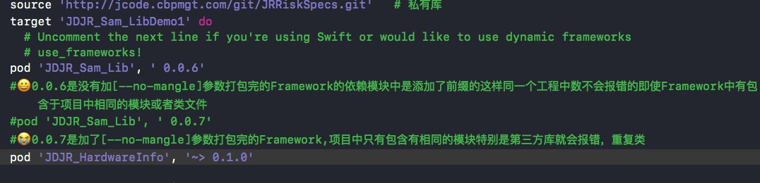 表示不使用 name mangling 技术,pod package默认是使用这个技术的。我们能在用 pod package 生成二进制库的时候会看到终端有输出 Mangling symbols 和 Building mangled framework。表示使用了这个技术。